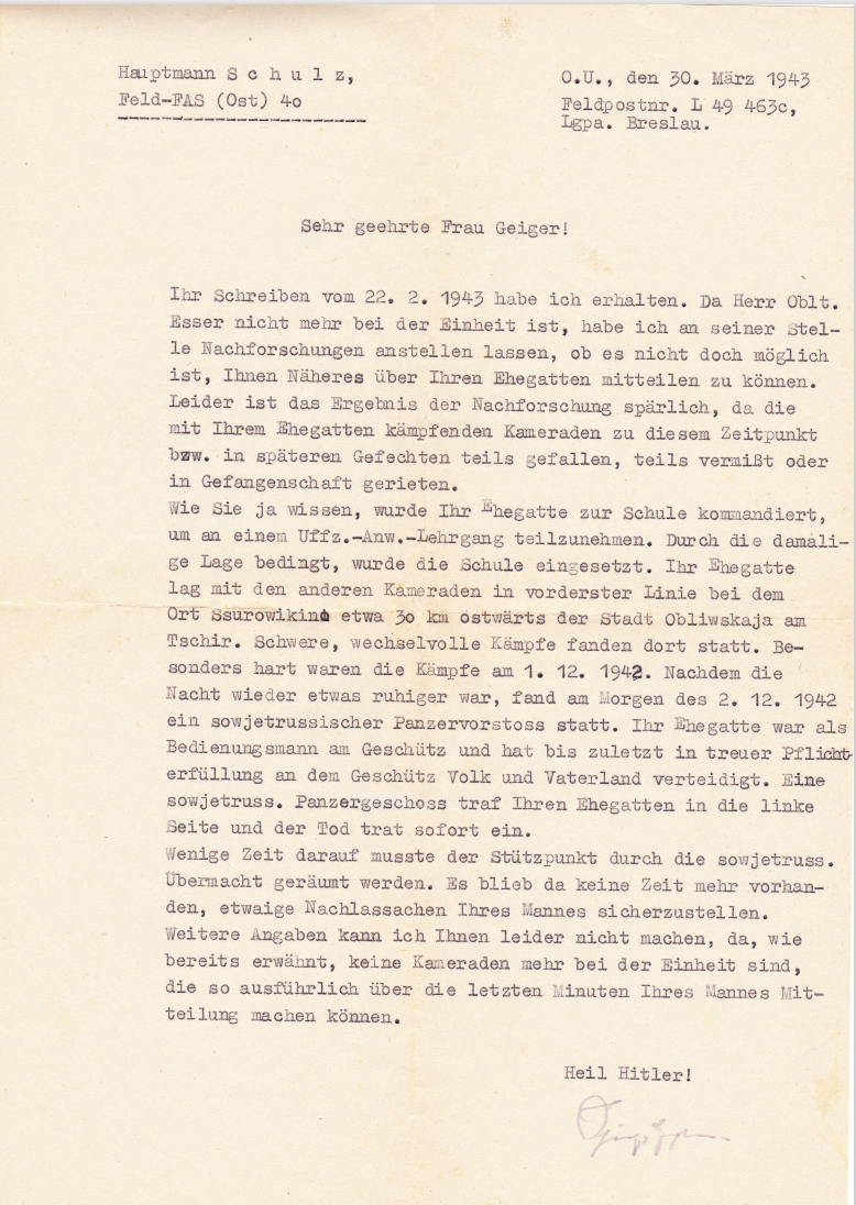 2.12.1942 in Ssurowikino (Surowikino) am Tschir, westlich von Stalingrad/Wolgograd, Russland) gefallen; Todesursache: Artilleriegeschoss Brust und Kopf, bei einem russischen Panzerangriff ist er durch einen Volltreffer als Richtschütze einer 2 cm Flak gefallen.